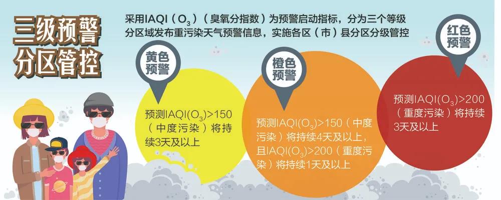 《預(yù)案》分級標(biāo)準(zhǔn)采用IAQI(O3)(臭氧分指數(shù))為預(yù)警啟動指標(biāo),由低到高依次分為黃色預(yù)警、橙色預(yù)警、紅色預(yù)警三個等級。同時,根據(jù)各區(qū)(市)縣空氣質(zhì)量實(shí)況和區(qū)域預(yù)測預(yù)報分析,還新增了分區(qū)域發(fā)布重污染天氣預(yù)警信息,實(shí)施分區(qū)分級管控。