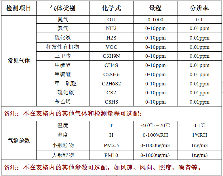 任選氨氣、三甲胺、硫化氫、甲硫醇、甲硫醚、二甲二硫、二硫化碳、苯乙烯、臭氣OU值在內的1-9個指標,目標氣體可進行任意組合、檢測原理不限、檢測濃度范圍不限,同時支持選配其他氣體和PM2.5、PM10、溫濕度、風速風向、大氣壓、噪音、照度等氣象參數(shù)監(jiān)測。